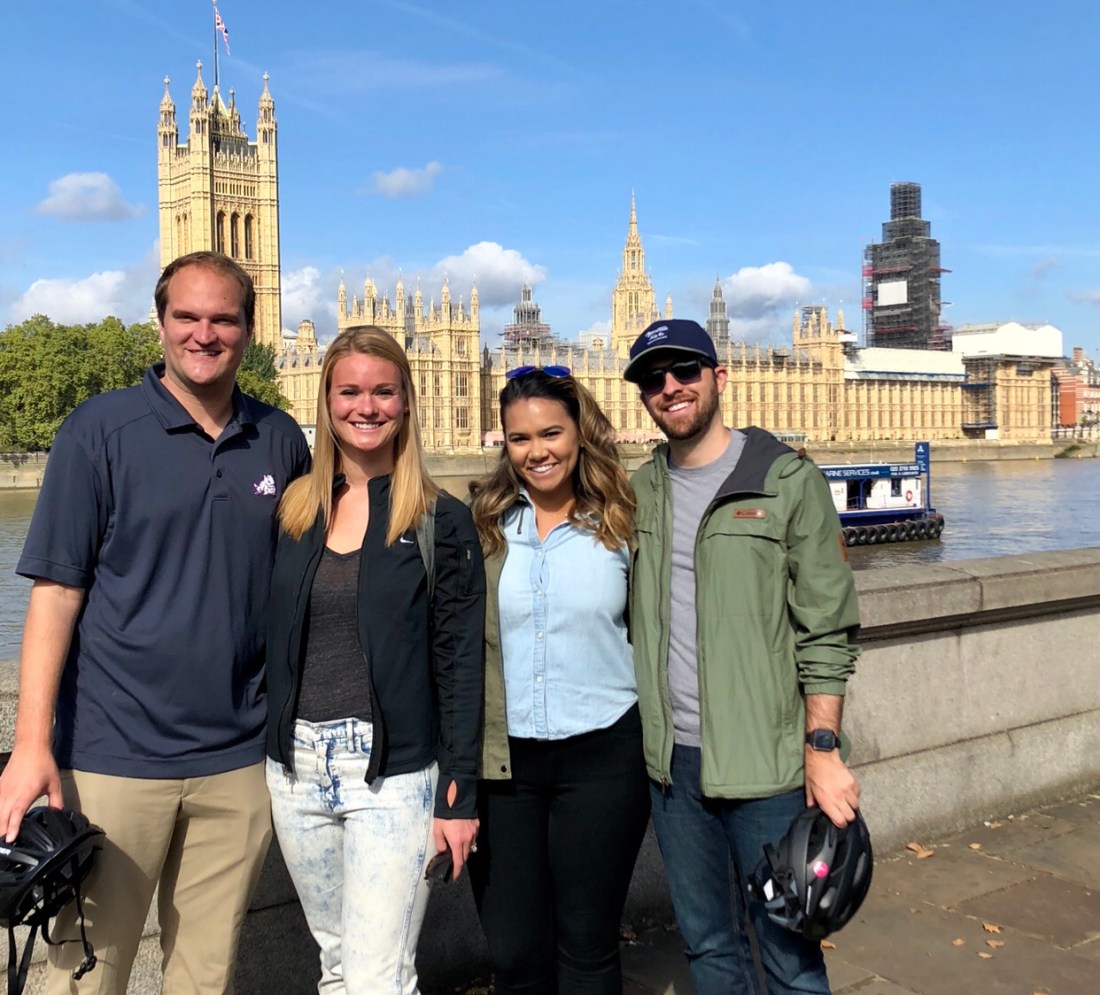 We woke up bright and early to go meet Kayla and her boyfriend (Reed) for breakfast. We said we would meet at 9 which Bill and I being the accountants we are we were there at 9 on the dot (more of less). Kayla and Reed underestimated travel time and made it by 9:30ish. When she walked in I immediately noticed a very shiny ring on a very particular finger. I was very confused, however, because just the day before she had referred to Reed as her boyfriend – not fiancé – and I had not seen anything about her getting engaged in social media so I kept my mouth shut since I probably had missed the post or something and I didn’t want to look like an idiot. We went of a bike tour post breakfast and I was praying this bike tour was more successful than our first (see previous post where I immediately fell off my bike and lost the tour group). Our guides from the start already felt more friendly than our Amsterdam guide so that was a good sign. Another good sign is the area we were picking up the bikes was not in fact in the busiest section of Amsterdam where bikers are out for blood and will run you over if ya I do not get the f out of their way. The tour over all was really nice. We saw some of the main tourist spots but also some spots we never would have found on our own. Some of the highlights in the photos below were parliament, a street with basements that were bomb shelters in WWII, Westminster school (fancy private grade school – ages 8 to 18 – that basically guarantees admission to Oxford or Cambridge for a cool £13K a trimester), London’s premiere wig shop (yes lawyers and judges actually wear these to court here), and a street in London where graffiti a la Banksy is legal and encouraged. Another fun story, we had a small break in the tour in Covent Garden and after about 20 minutes on the patio of Punch and Judy, I feel a tap on my shoulder and I turn around and it’s one of my old coworkers from EY Fort Worth Amber! What a small world we live in. How is it that of all the places in all of London she happened to be in the same part of Covent Garden at the same time as us. Crazy.