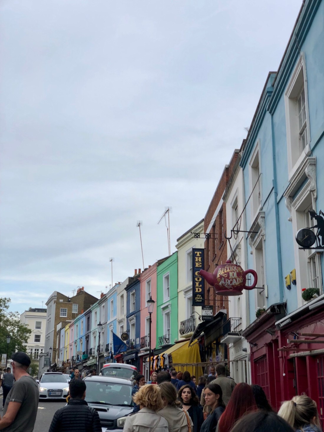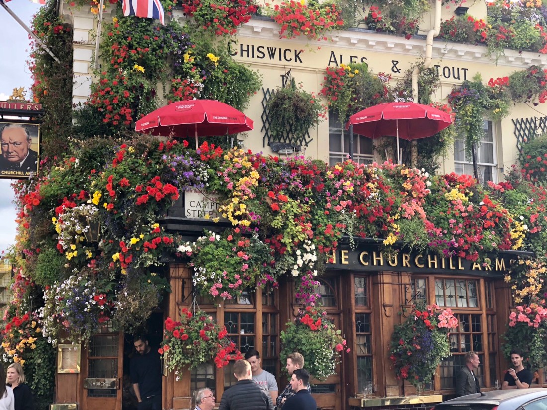 Post bike tour (now one bike tour without incident thank you) we attempted to go to Sky Garden. Kayla and Reed looked into going here the day prior and were told you had to have a reservation but you could get in without one before 6 pm. So we tried. That was false. We were told we could try and get in after 9 without a reservation but we had to be “smartly dressed” she said as she gave us all a once over. I will say we were casually dressed but the way she said smartly dressed she had like such disgust in her voice. Rude. As T Swift would say, why you gotta be so mean? After her attitude we decided we didn’t want to go there anyway so we headed up to Notting Hill to check out the Churchill Arms bar and Portobello market. Churchill Arms you have probably seen on some social media influencers page. It’s a cute little bar with flowers all on the outside and when you venture inside there is all the memorabilia covering the walls and ceilings.