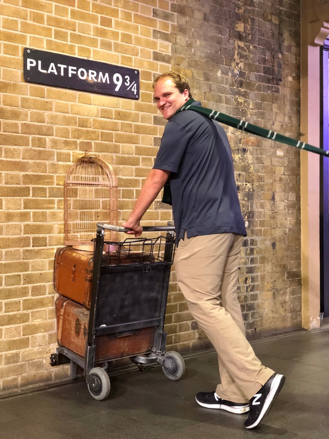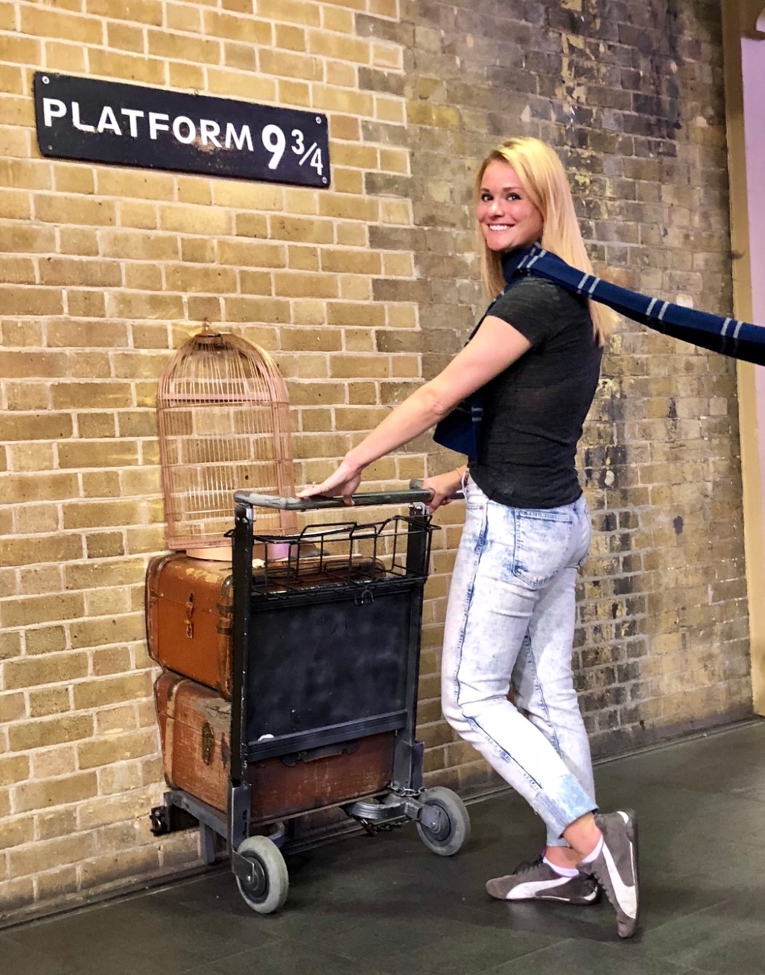 After a few snacks we decided we were hungry for real dinner so I made the executive decision to take the group to Dishoom. If you like Indian food, Dishoom is fabulous and you should definitely put it on your list if you’re in London. For being so yummy it’s also not too terribly priced which is like crazy for London. On our way over there the mystery of the engagement ring was finally revealed. Turns out, Reed has proposed to Kayla THE NIGHT BEFORE but they didn’t say anything. Now I felt like an ass for trying not to be an ass and not asking about it earlier. She said they didn’t want to make the day all about them but for the record, that would not have been selfish of her at all. You only get engaged once! When we got to Dishoom we were able to have a proper cheers to their engagement and celebrate them. The food was fabulous and with full tummies we went back to Shoreditch to have some post dinner drinks. On our way, we had to switch tubes at the Kings Cross station so of course, we had to go up to Platform 9 3/4. What an interesting experience. I thought we would just be able to walk up and take a picture. Warner Brothers, however, was not going to miss out on such a prime opportunity to capitalize on tourists. They have now set up a store at Platform 9 3/4 and there is a line to have your photo taken. There is also someone to help place your scarf on you, properly make the scarf billow for the actual shot, and help you organize poses for a group shot. What should have been a 5 minute detour quickly became 45 minutes of tourist nightmare. The poses were so dumb they had people do and we completely unrelated to the location – why would you be dueling with someone on a luggage cart while trying to pass through to the train. No plot accuracy! In rebellion we took one normal picture with the scarf of our choice (#Ravenclawforlife). We walked through the store (you have to in order to leave – Disney strategy to force exit through the gift shop) and they asked if we wanted to see our photo they took to which we said nope and walked on. For your viewing pleasure, the perfectly acceptable, plot accurate, photos we took ourselves.