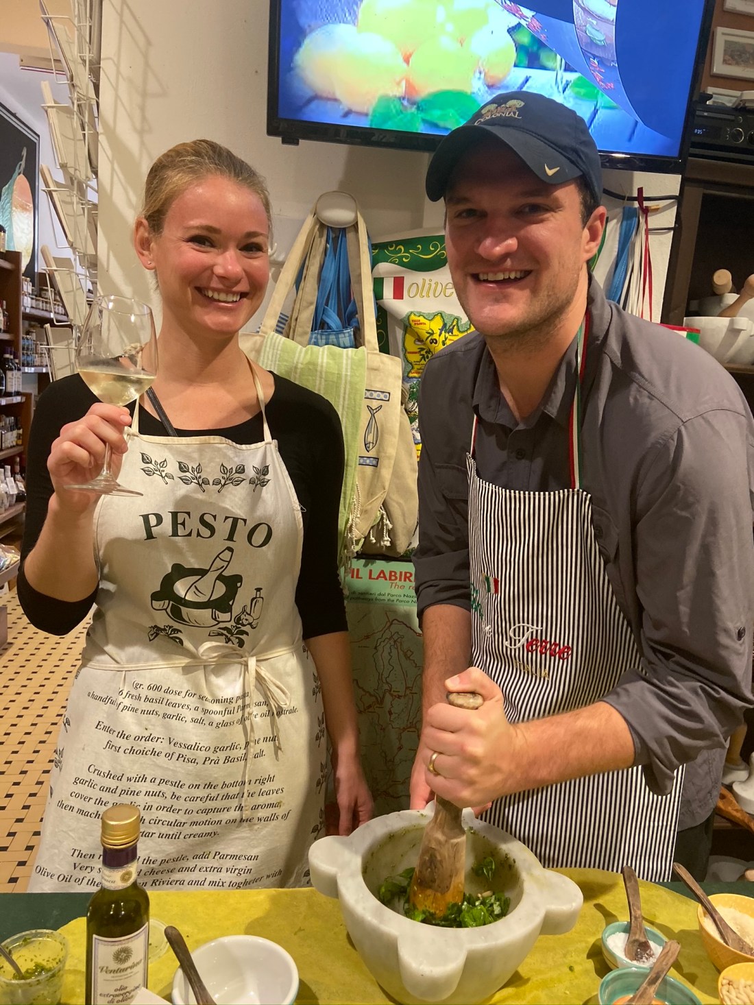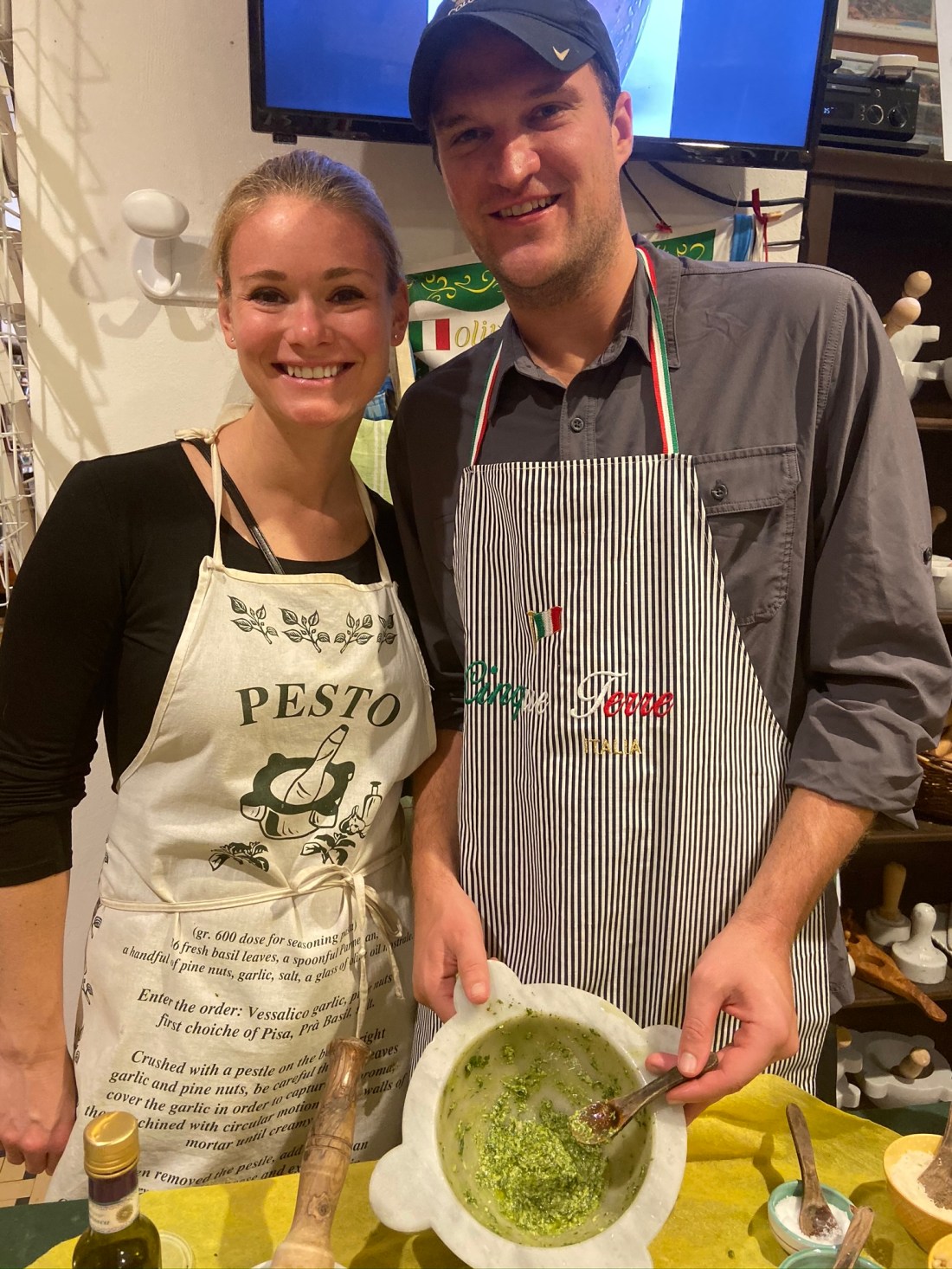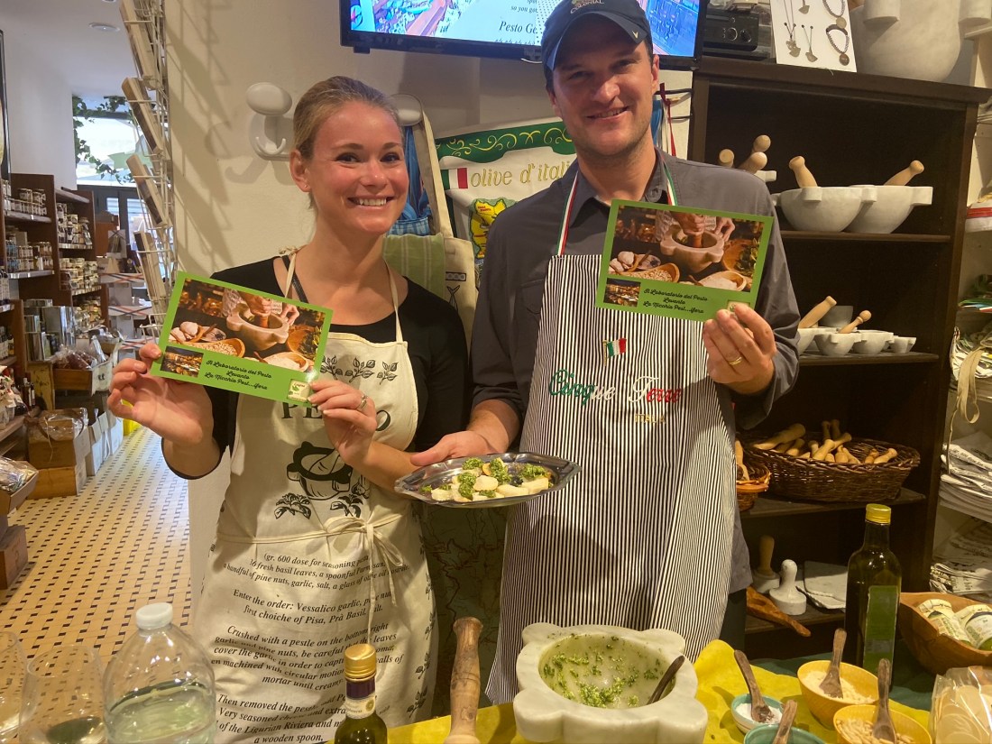 The next day we braved the rain and headed to Levanto to try our hands at pesto making. Pesto is famous in the region because Genoa right to the north has lots of yummy basil. You’ll be glad to know Bill and I received our pesto licenses and also achieved in making some delicious snacks.