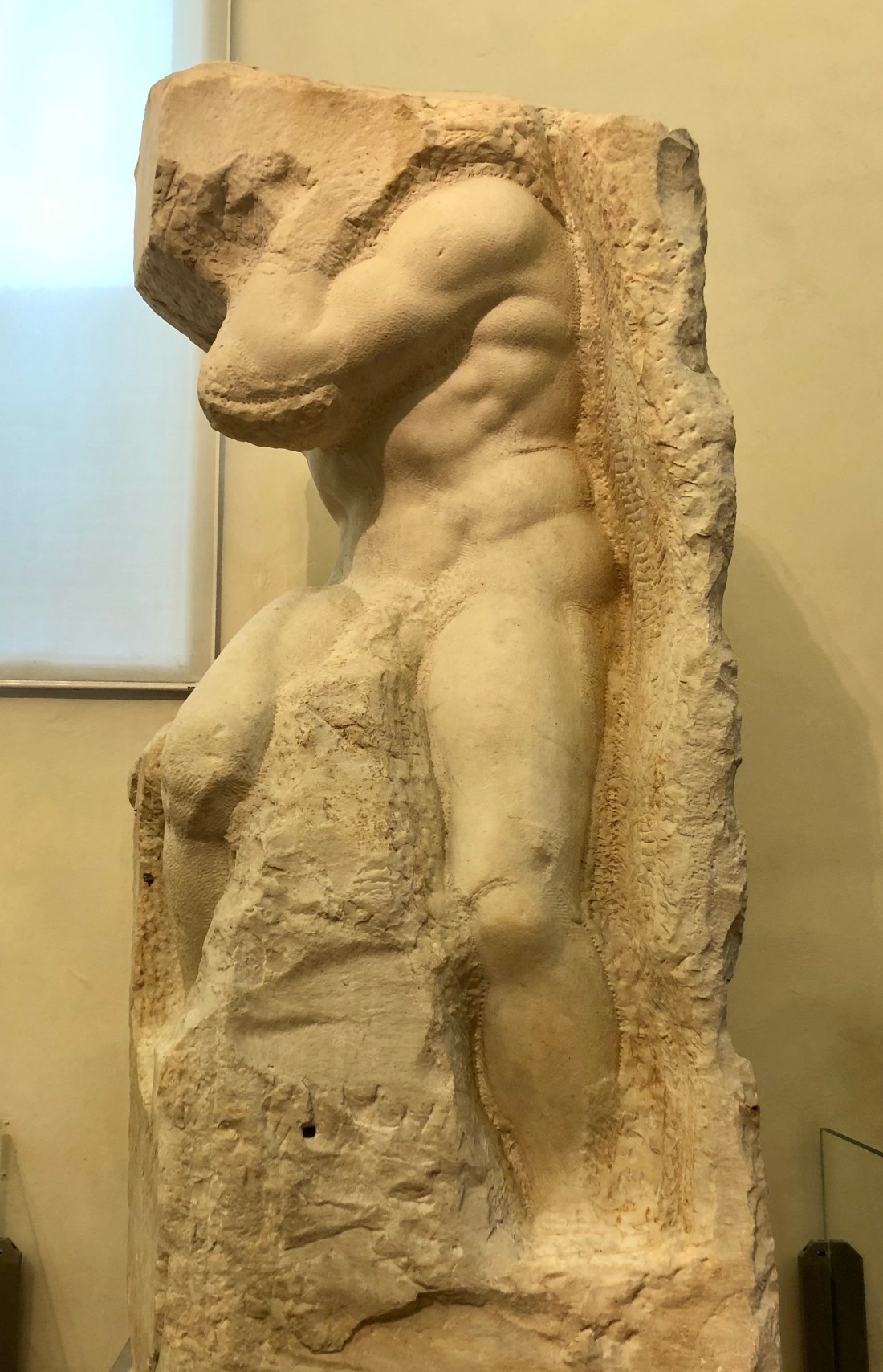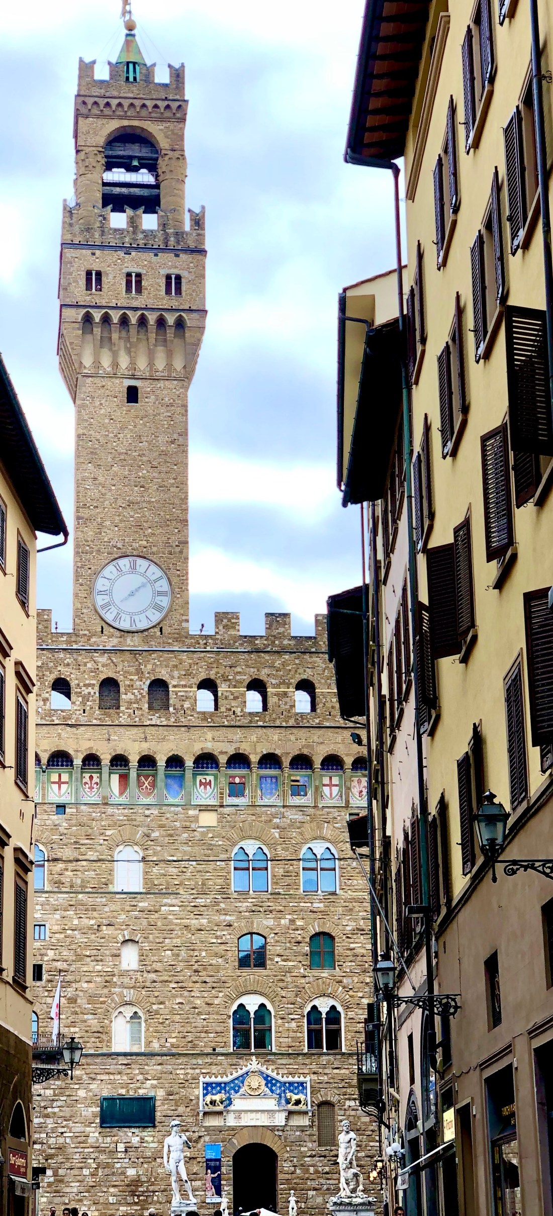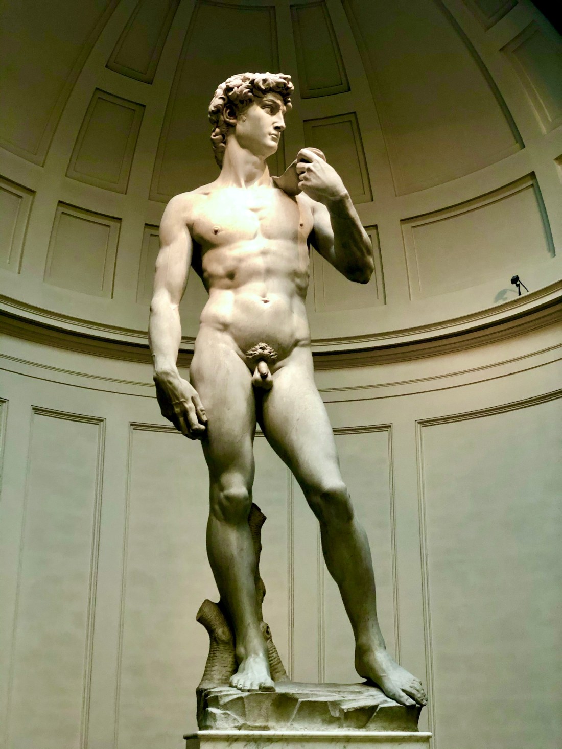 In the spot where the David first stood is a full size replica. David is shown waiting to fight Goliath, slingshot over his shoulder, anxiety in his eyes. I share details of him later but the positioning of the statue is interesting. He faces Rome, the Goliath of Italy.