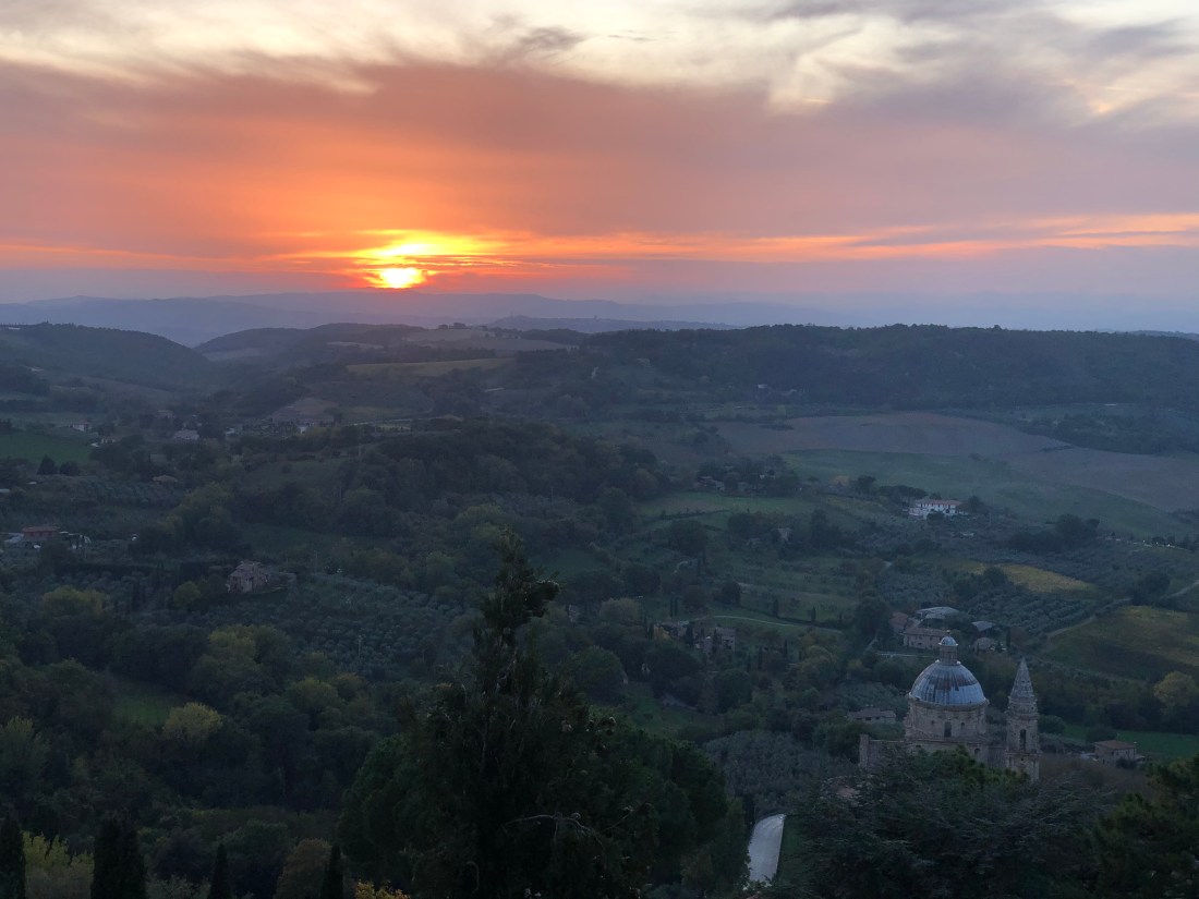 Our next stop was the Airbnb which was really nice. When they say the Tuscan hills by the way, they are not kidding. We hiked up towards the top of the hill to just make our way back down to a small church. I wish we had brought a blanket to spread out on the soft grass and enjoy the sun but we made do with what we had. When we were about to walk up Bill says “I messed up” because right there was the restaurant we were scheduled to eat at in 3 hours time. More hills for us! It was definitely worth the trip back up though because the sunset was incredible. We found a place that offered a great view and wine and settled out to absorb all the colors.