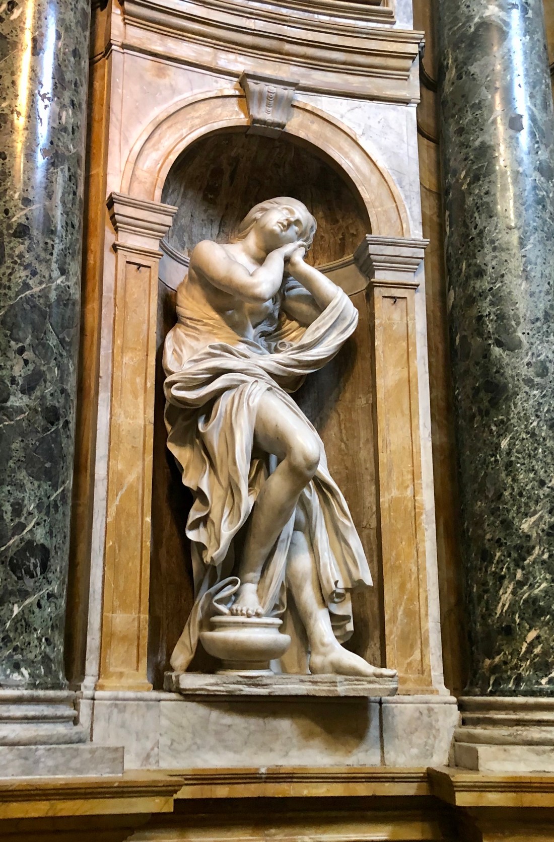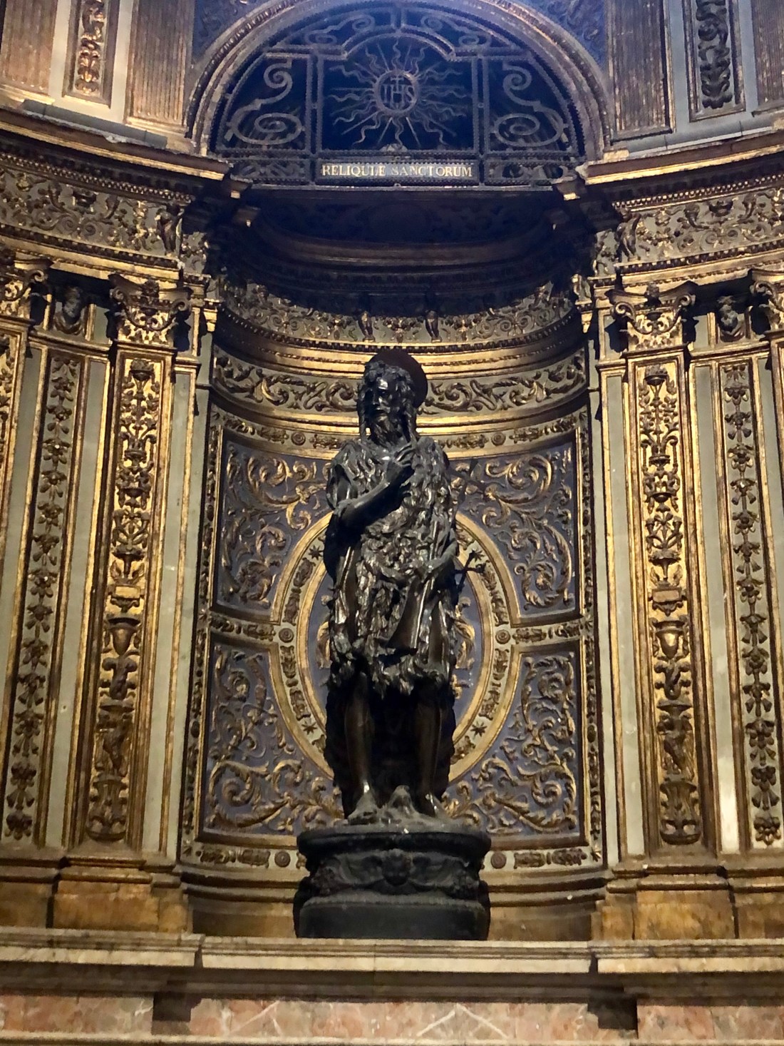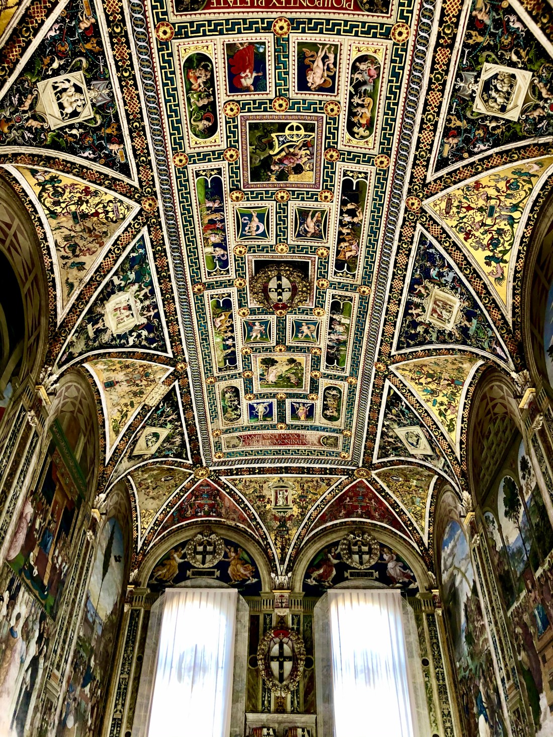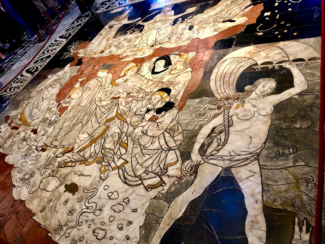 The real star however is the inside. From the stripped columns to the marble mosaic floors to the painted ceilings to the statues by Donatello and Bernini and Michaelangelo to the beautiful marble pulpit and the library dedicated to Pope Pius II, there is so much to see! This church isn’t highlighted is often overshadowed by the duomo of Florence but what that duomo in Florence has in size, Siena has in beauty in the inside. We had our guide inside but we also supplemented her information with the free a Rick Steves walking tour for Siena which has specific tracks dedicated to the church.