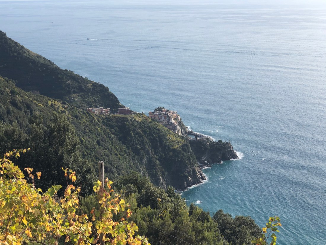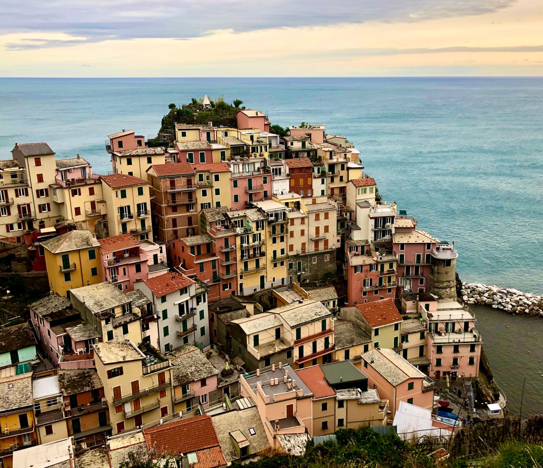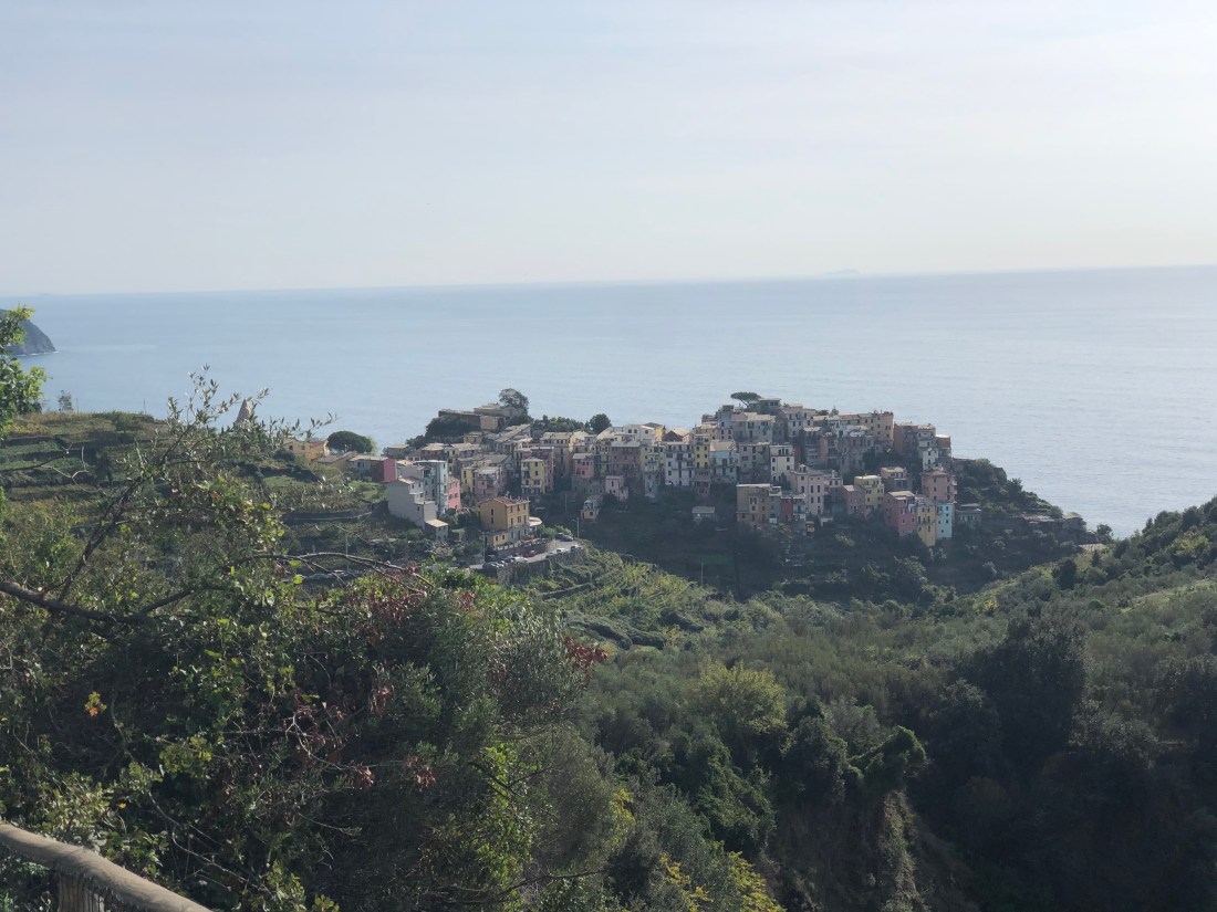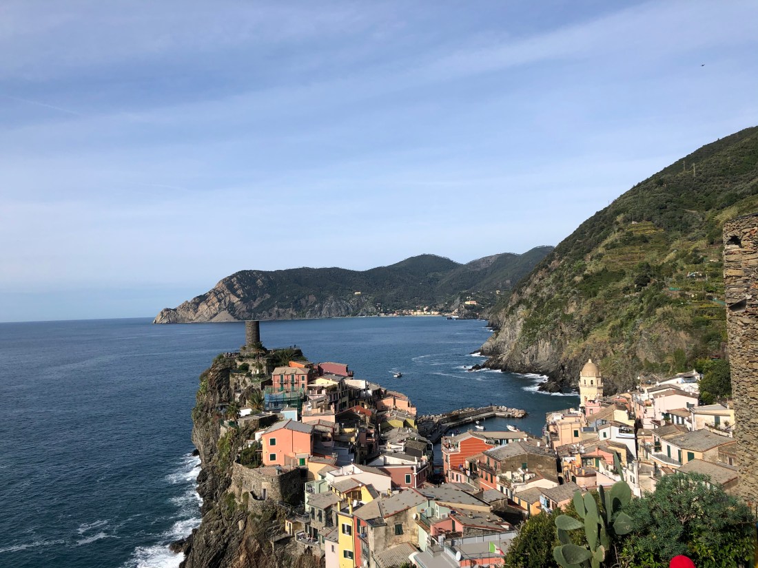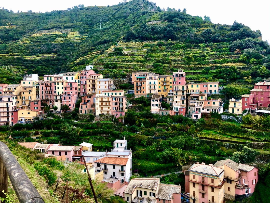 Once we got back to Manarola the weather had cleared up a bit and we were able to take a short path for some views of Manarola. Note in the picture directly below our Airbnb is the pink building, top floor right by the little White House – literally the highest point.