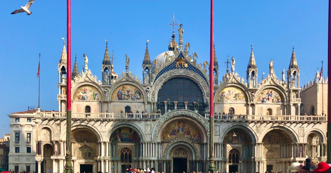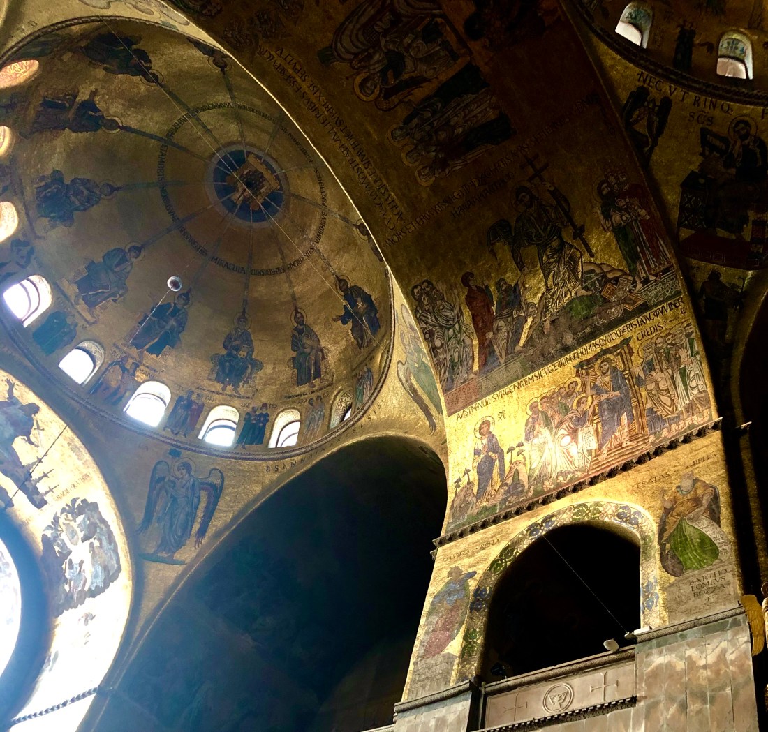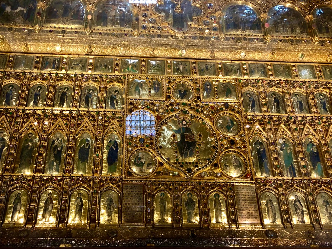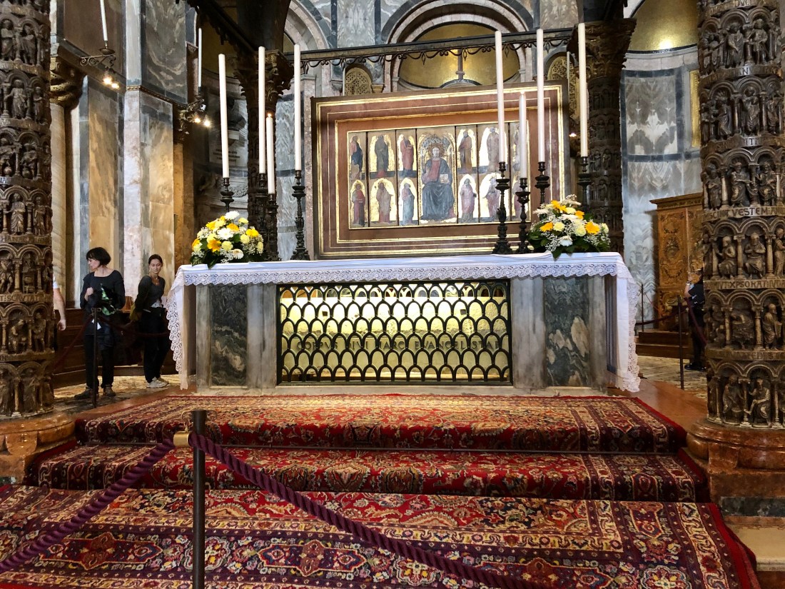 Rick then also accompanied us inside St Marks Cathedral (fun fact you can also call it a Basilica or a church – it’s all 3!). St Mark was one of the writers of the gospel and at one point he docked in Venice where he dreamt an Angel spoke to him saying “Peace to you Mark, me evangelist” and promised him rest after his death. He died being dragging through the streets of Alexandria and his body was eventually smuggled out of Egypt by Venetian merchants who returned it to St Marks in Venice. If you pay €2 to enter the Pala d’Oro you can see his tomb under the alert and the golden altarpiece detailing his life in elaborate fashion. Well worth the small fee.