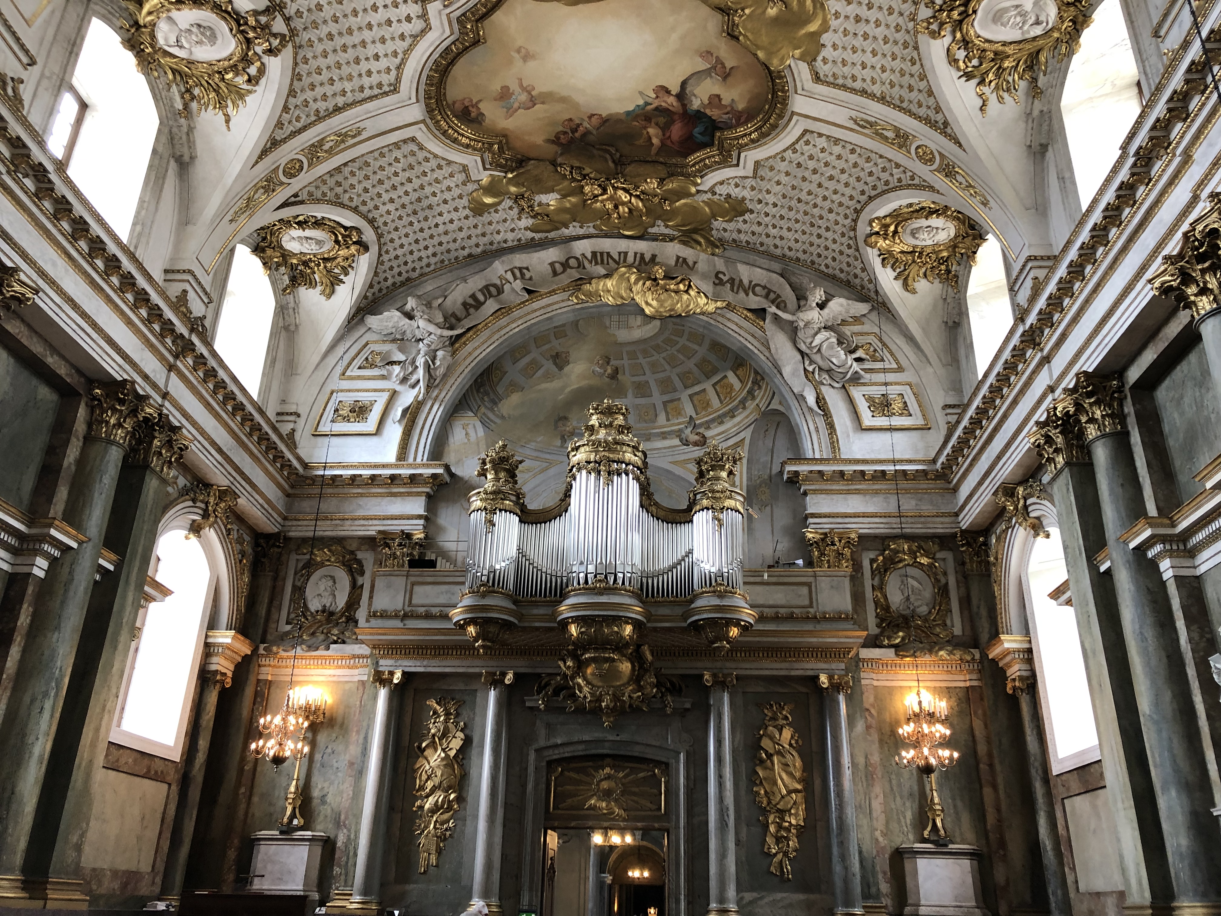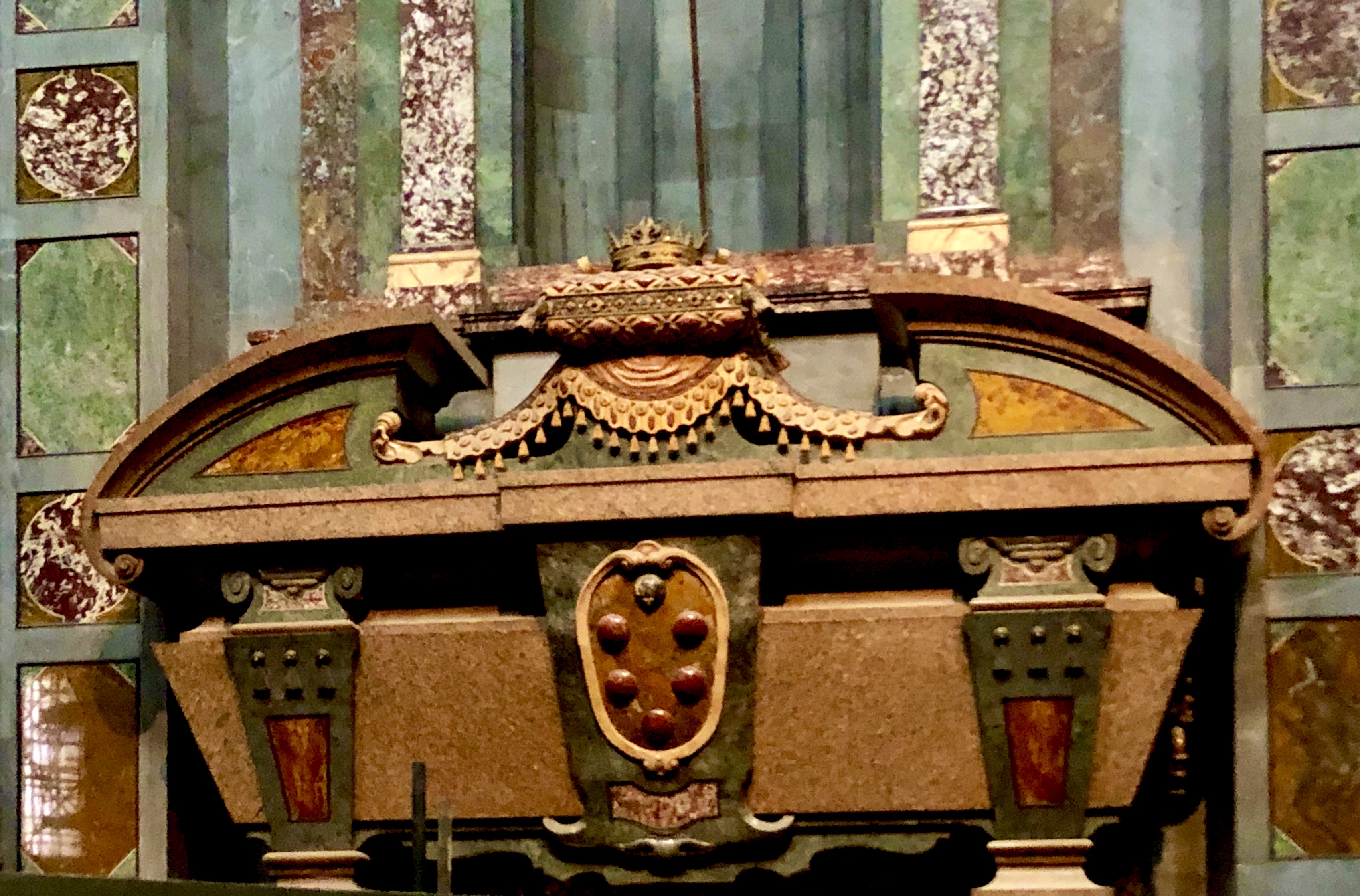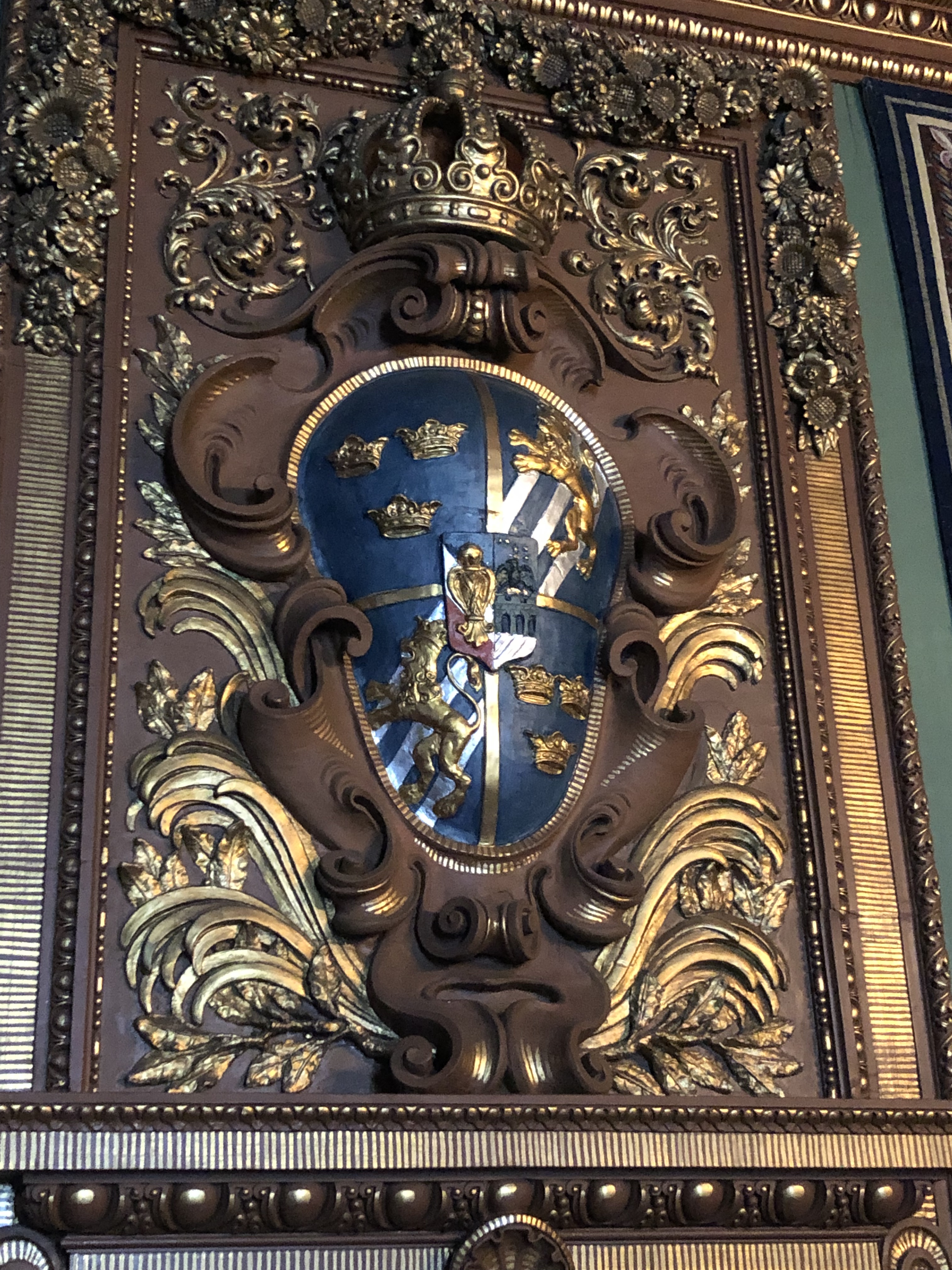 The gold room is made with real gold. There is only 10 kg total though. There are two layers of glass with golf leaf in between. One wall of the gold room is contemporary Stockholm (except old castle that burned in 1697). At the top sit St Erik but he is missing one very important body part. His head! After the motif was designed they added marble benches which were not planned for and so now St Erik is headless.