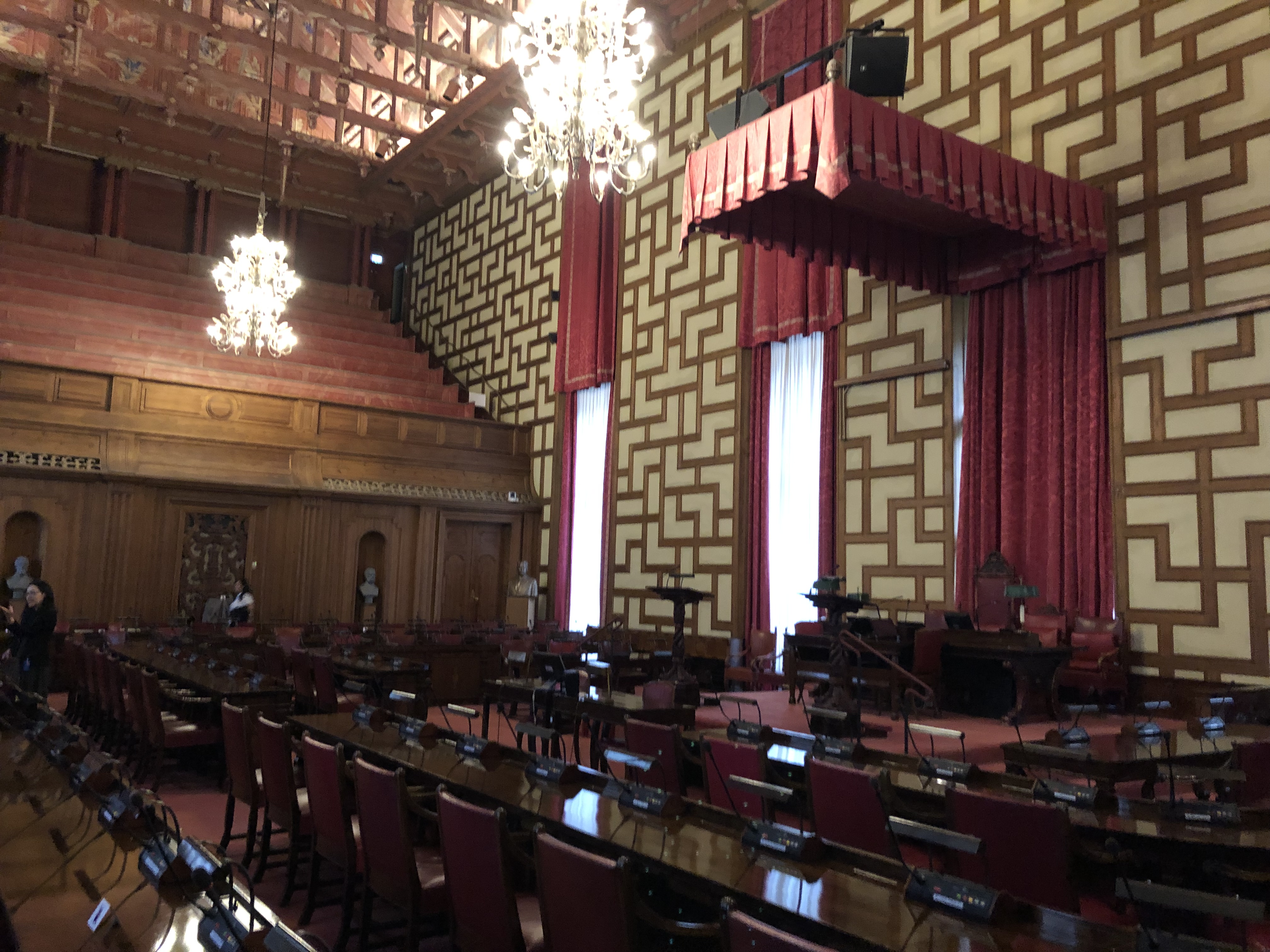 From the blue hall we went the the city council chambers. There are 101 members of the council (prevents a tied vote) of which 50 are men and 51 are women currently. Only 13 are full time city council members so most have other jobs and they meet every third Monday of the month. These meetings are open to the public. The ceiling of the city council chambers was inspired by a Viking long house.