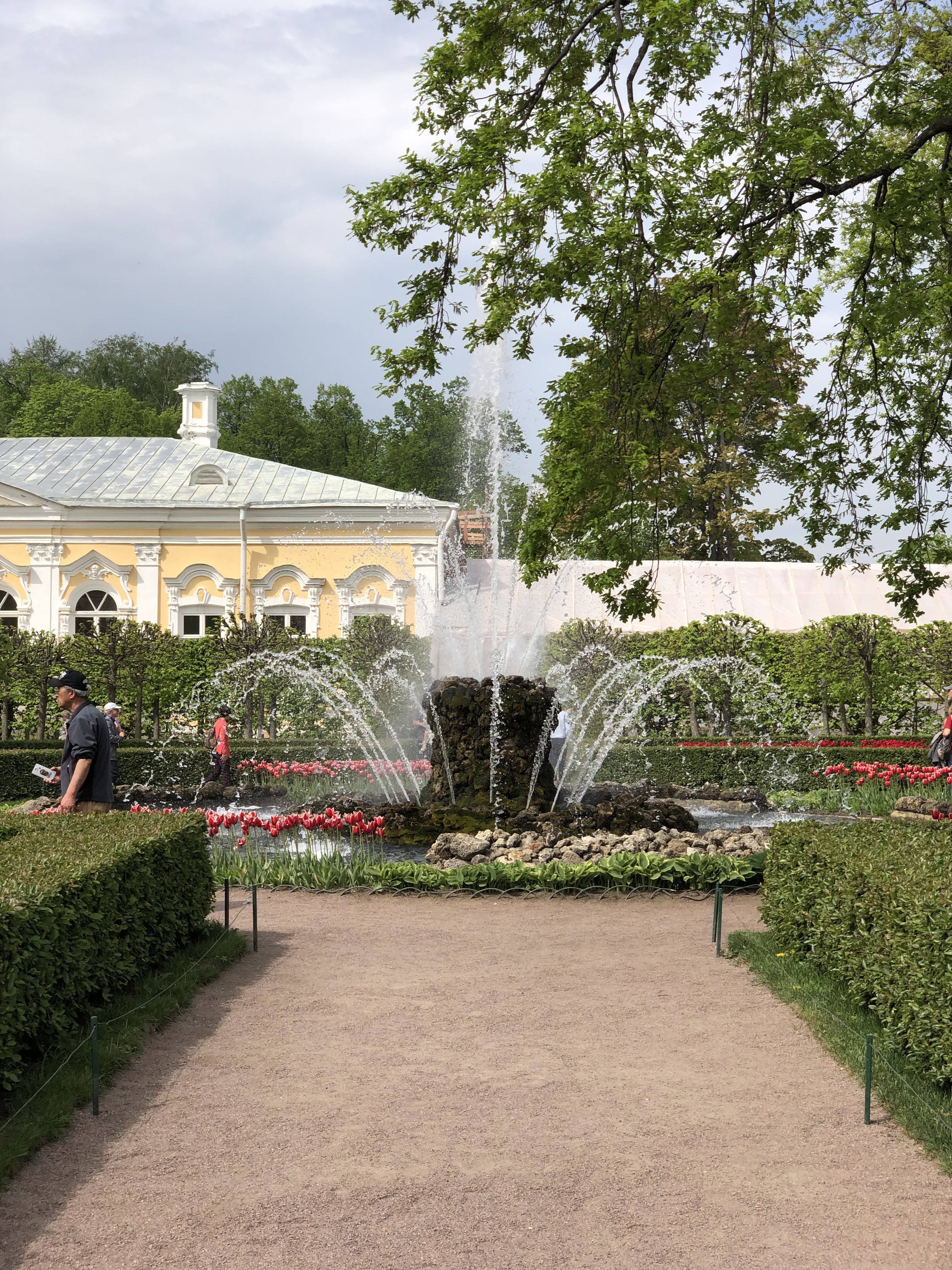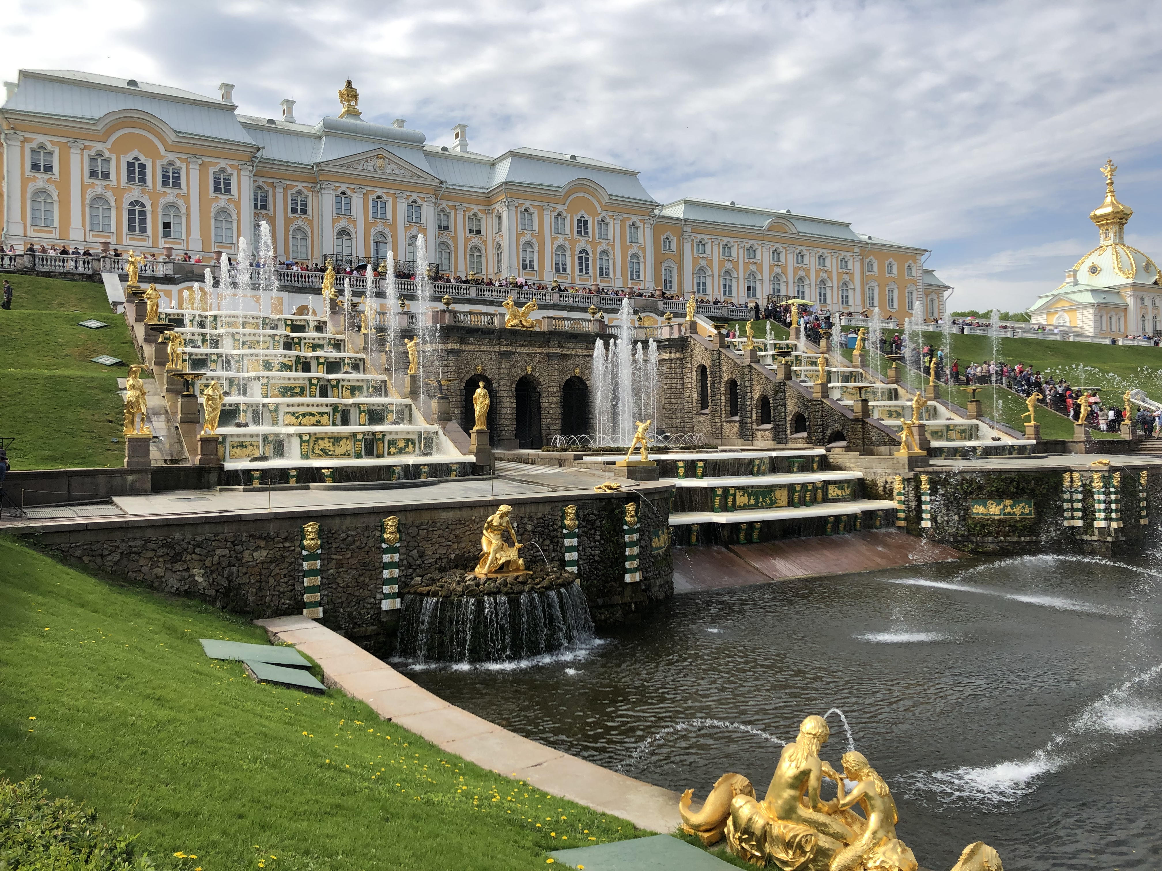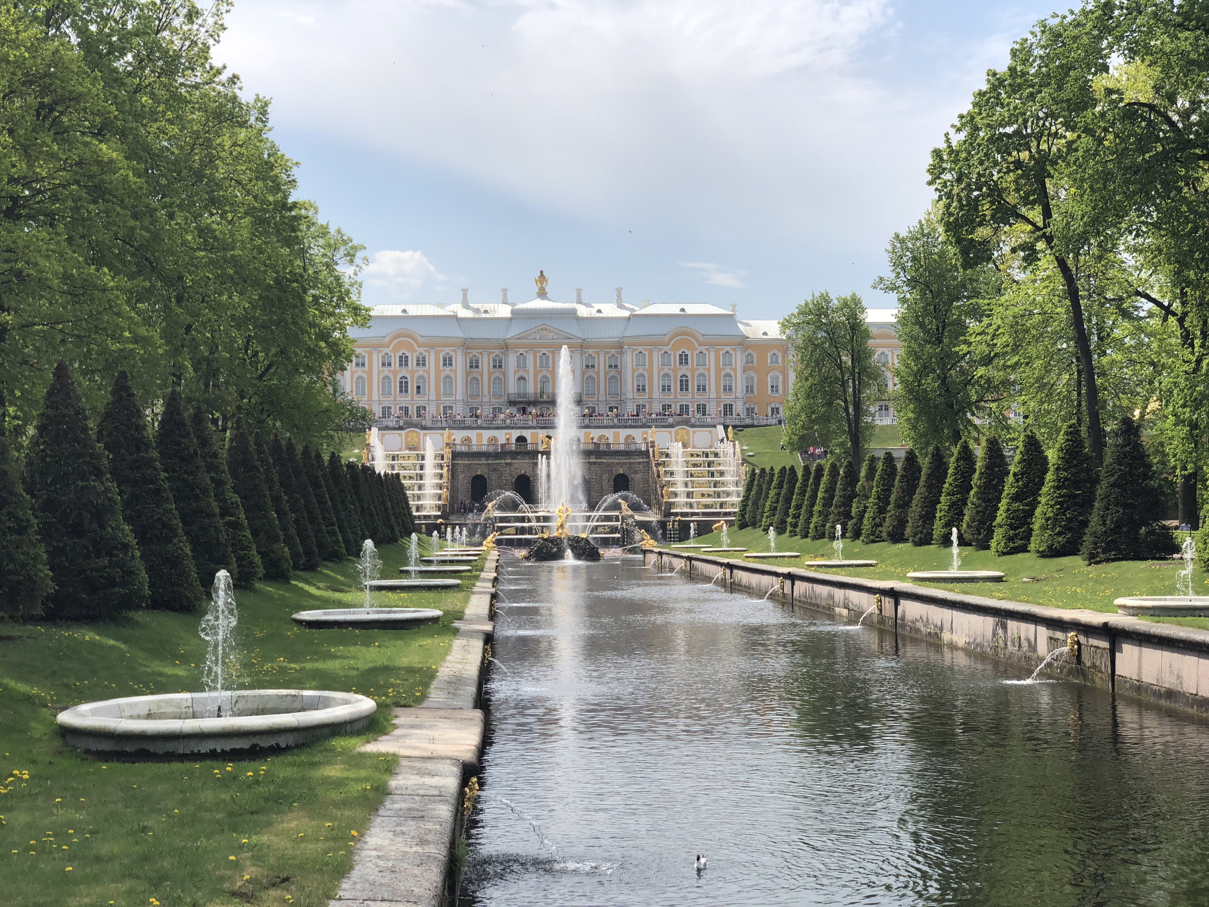 As we finished in the place our guide rushed us outside to witness the starting of the fountains in the back grounds. The fountains are THE thing at the Peterhof. There are over 150 fountains. The water from all the fountains comes from springs and force of gravity powers the display. The main fountain is known as the grand facade. The large fountain in the center is a symbol of Russia’s (Sampson) victory over Sweden (the lion). This was actually the only fountain that is not original as it was too large to hide before the Nazi occupation.