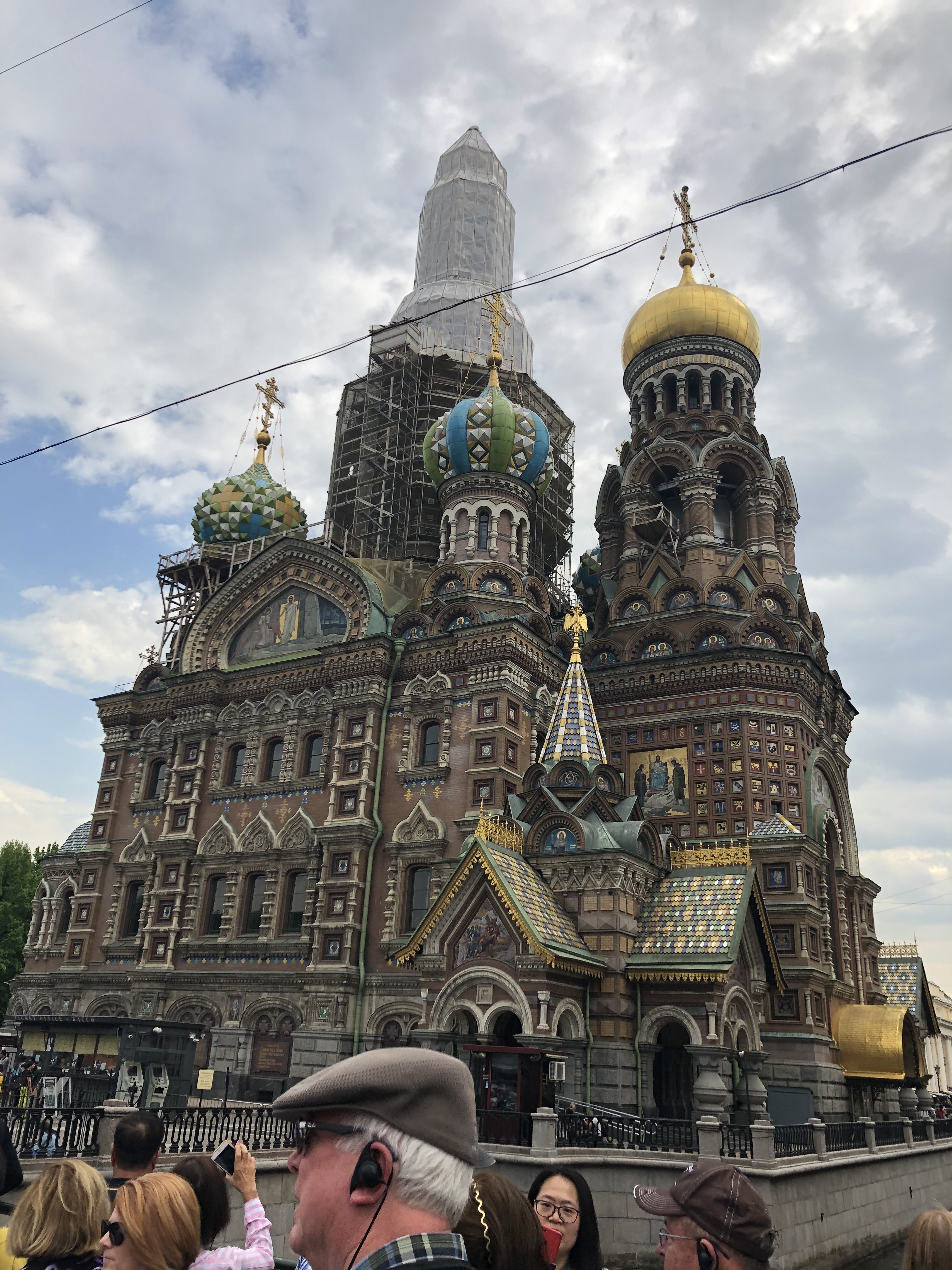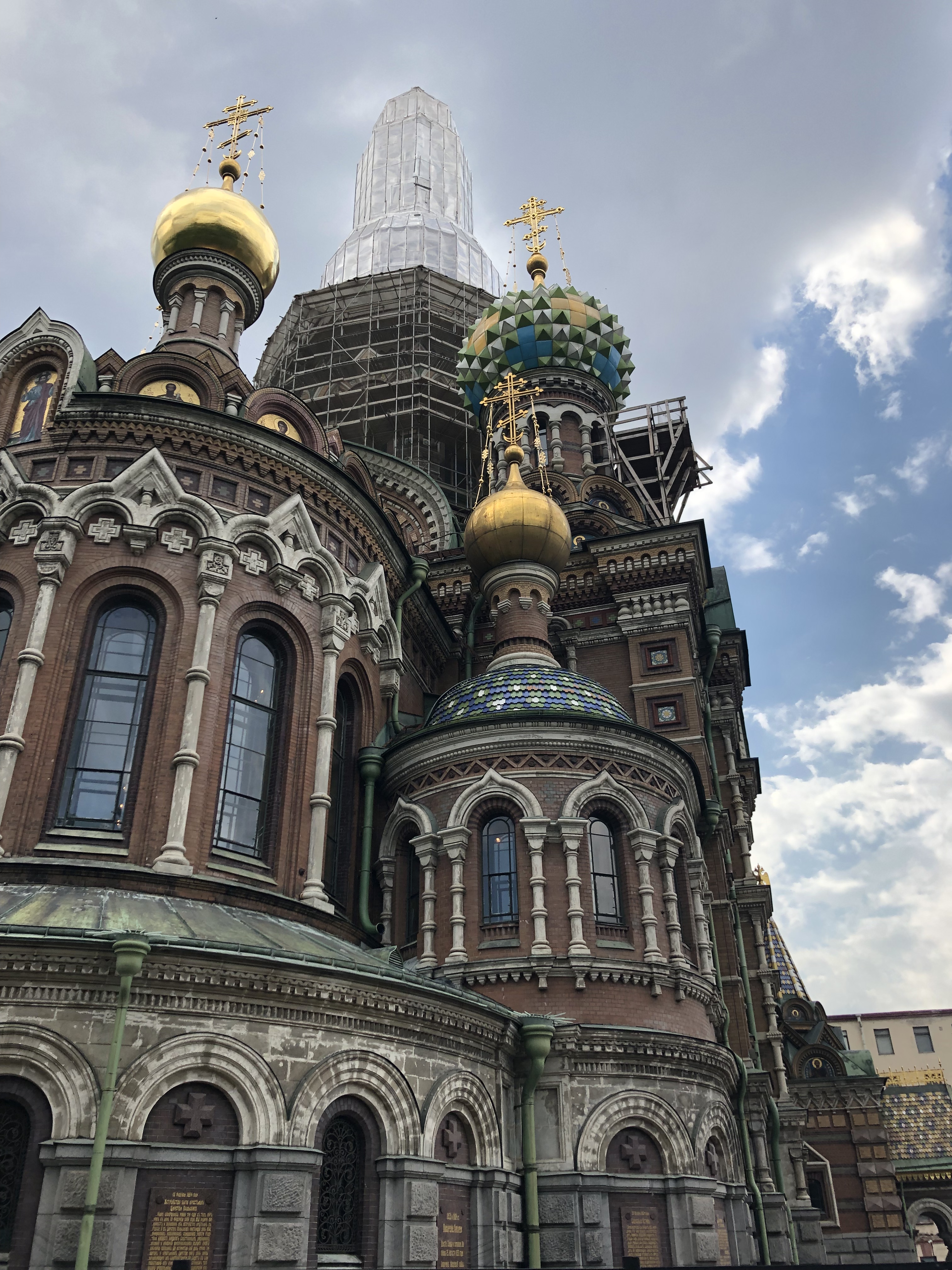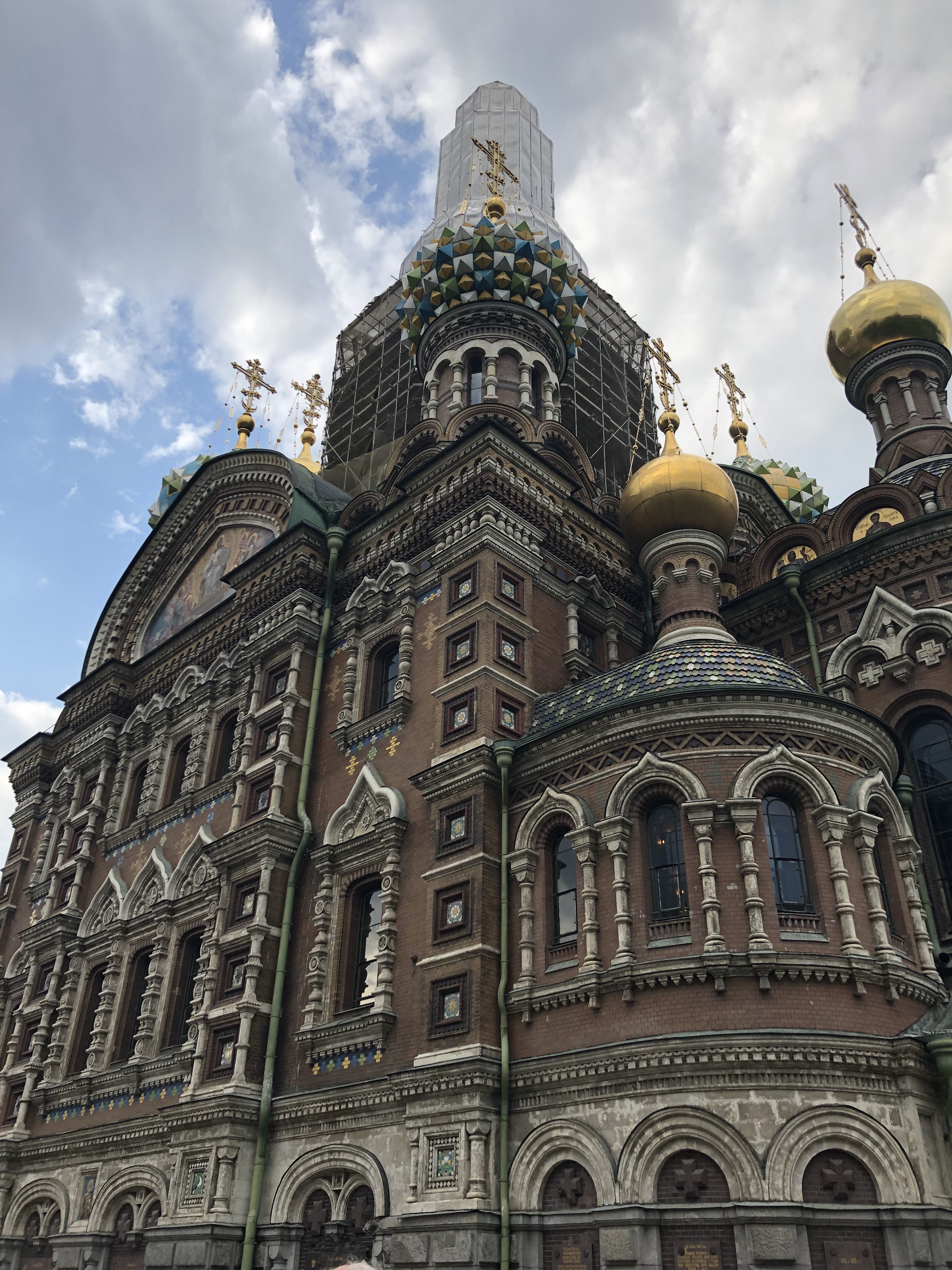 Post lunch we headed to the Church or Spilled Blood which could be mistaken for the well known St. Basels in Moscow probably because it was modeled after it. The history of the church is quite interesting. In 1881 Alexander the Second was attacked and killed on the canal by a bomb ( actually the second bomb that had gone off as he survived the first one). The attack was the 8th attempt on his life so you could say some people really had it out for the guy. His family commissioned a church to be built over the area where he was killed as a monument. As a symbol of the Russian royal family the church was closed after revolution and turned it into museum of revolution. Displayed were portraits of the people who killed Alexander the Second. Ultimately the Russian people wanted the church destroyed but they did not blow it up because they couldn’t do so without damaging the area. Instead, they planned to disassemble the church but then WW2 broke out. Amazingly the church survived the war bur they did find a bomb shell that went through the central dome inside the church that had not gone off so it’s a real miracle it’s still standing. Although maybe not for those who wanted it destroyed in the first place. After the war it was used as a storage facility. When they decided to restore it, the project took 27 years and the church finally reopened in 1998. More recently, they began to refurbish one of the gold domes with the intention to complete the restoration in time for the World Cup. When it became clear, however, they would miss this deadline all worked stopped and it remains under scaffolding today.