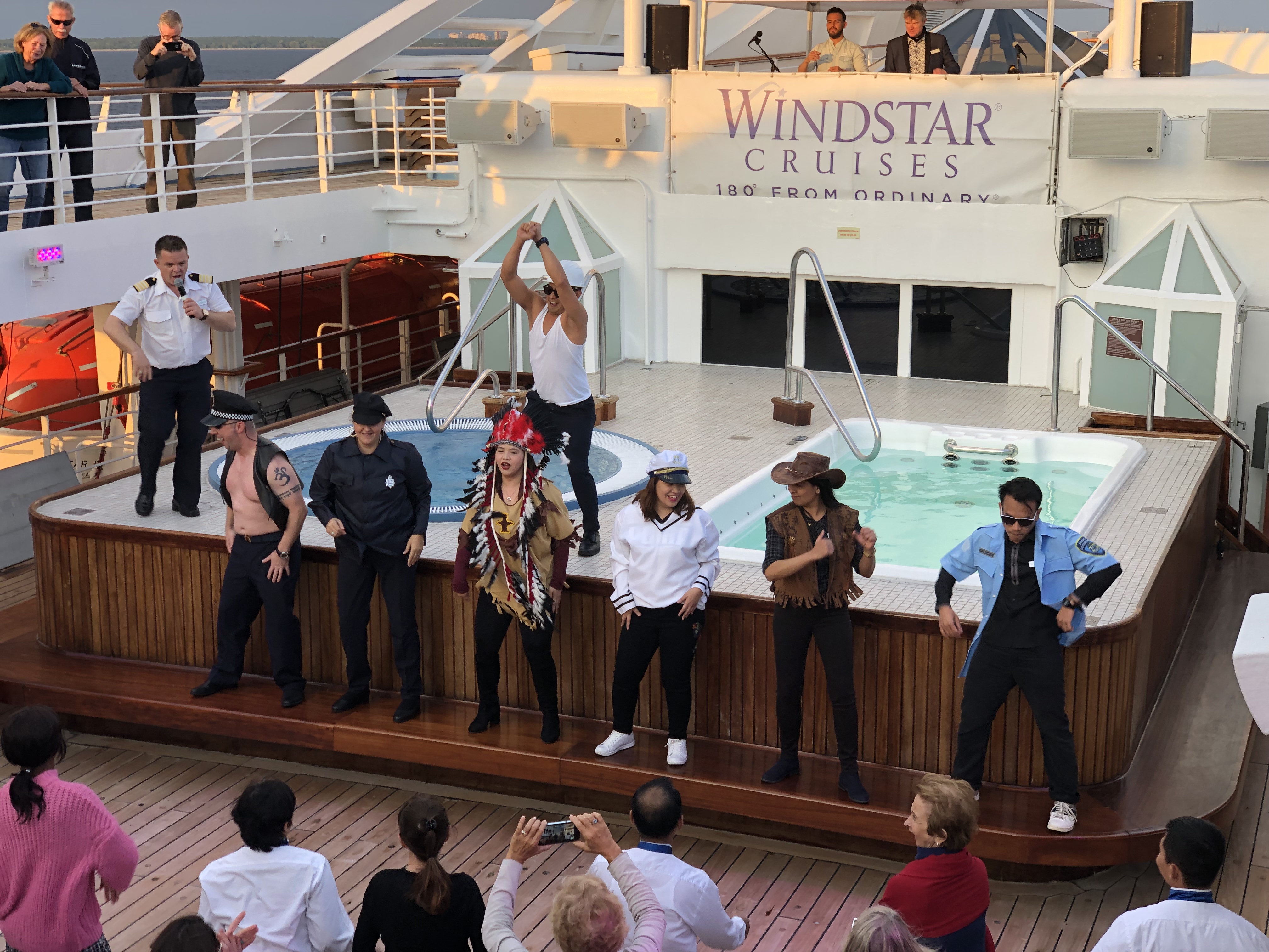 Once we had our fix of spilled blood (I’m punny) it was back to the ship – with some shopping on the way. So I’ll leave you with a photo of me modeling the hat we found in the shop (not purchased) and a photo of the cruise ship crew in their performance ware (full village people for YMCA). Until the next adventure!! Dasvidaniya!!